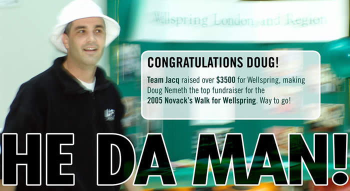 DATE: Saturday, September 3rd, 2005 Monday, May 30, 2005 The readings from the funeral are now available as a pdf. Saturday, April 2, 2005 London Free Press article about my Dad. Tuesday March 29, 2005 A new letter from Wally. Monday March 21, 2005 New update from Wally. Saturday March 19th Yesterday's funeral honoured Jacqueline very well. I was told that this was the largest event ever held inside the church. 300 people attended the ceremony at the 150-seat church. Please don't tell the fire marshall. From what I understand this figure does not even include those who sadly could not be accommodated. I hear some guests celebrated the event together at the Tim Horton's down the road. The Jacquie I know would have laughed in utter disbelief and found it completely complimentary. We sincerely regret the church could not accommodate everyone that wanted to be there. Having the funeral at St. Anne's was among the few preparations Jacqueline discussed. If you would like the photo slideshow DVD as shown during visitation or photo prints, feel free to request a free copy from any of us. Please donate to one of the designated charities or just give blood. (To the Red Cross, not to us ;) ) The guestbook will remain open indefinitely, as will our doors. Friday March 18th Funeral details: Thursday March 17th Many thanks to today's visitors. Visitation continues today from 2PM-4PM and 7PM-9PM. Wednesday March 16th Here is the public announcement as inserted in the London Free Press and Hamilton Spectator. NEMETH (Cherwaty), Jacqueline Elizabeth - With grace and dignity at home, Jacqueline Elizabeth Nemeth (Cherwaty), on March 13, 2005, in her 40th year. Loving wife of Doug Nemeth. Dearest daughter of Walter and Diana Cherwaty. Daughter by love to Adele Holmes (James) and Robert Nemeth (Roma). Precious sister of Gregory and LoriAnn, Grant and Molly, Graham and Melanie, and sister-in-law to Tyler and Michelle. Wonderful auntie of Keaton, Cierra, Samuel and Zachary. Mom to Samson. She will be sadly missed by many nieces, nephews, cousins and friends. Visitation in the Lloyd R. Needham Funeral Chapel (520 Dundas Street, London), on Wednesday from 7-9 p.m. and Thursday from 2-4 and 7-9 p.m. The complete Funeral Service will be conducted at St. Anne's Anglican Church (1344 Commissioners Road West, Byron), on Friday, March 18, 2005 at 2 p.m. Cremation to follow. At Jacqueline's request, in lieu of flowers, donations to the Canadian Cancer Society, London Regional Cancer Centre, LHSC Adult Oncology Unit or Wellspring Centre would be appreciated. Needham Funeral Service - London www.needhamdignitymemorial.org Monday March 14th Jackie passed away peacefully around 8PM last night at her parents' home in London. She was comfortable and surrounded by loved ones. Her husband Doug, in particular, ushered her through with inconceivable strength, compassion, and love. I will be forever grateful for that. She will be sorely missed and warmly remembered. Your thoughts are welcomed in the guestbook. Here is a copy of today's general letter from Wally, Diana, and Doug. Funeral arrangements are as follows: Visitation Service (now confirmed) Reception Interment Memorial Gifts Sunday March 13th An update will be posted here around noon tomorrow, March 14th. In the meantime you are welcome to call Jacquie's parents at 519-433-7955, or her brother Graham at 519-488-1452. Monday March 7th Jacqueline is now at her parents' house. Please call prior to visiting, just to be sure she's up to it. 433-7955. Here's a map. The adjoining church has never seemed to mind us using their parking lot, except on Sunday mornings, of course. Some pictures are available after several requests. It's possible some people might not want to see pictures of her at the hospital, so be aware there are some very recent shots. But she looks great to me :) Pictures. Sunday March 6th Thanks for all the guestbook entries everyone! I delivered the first batch last night and will continue to do the same daily. Friday March 4th Thursday March 3rd